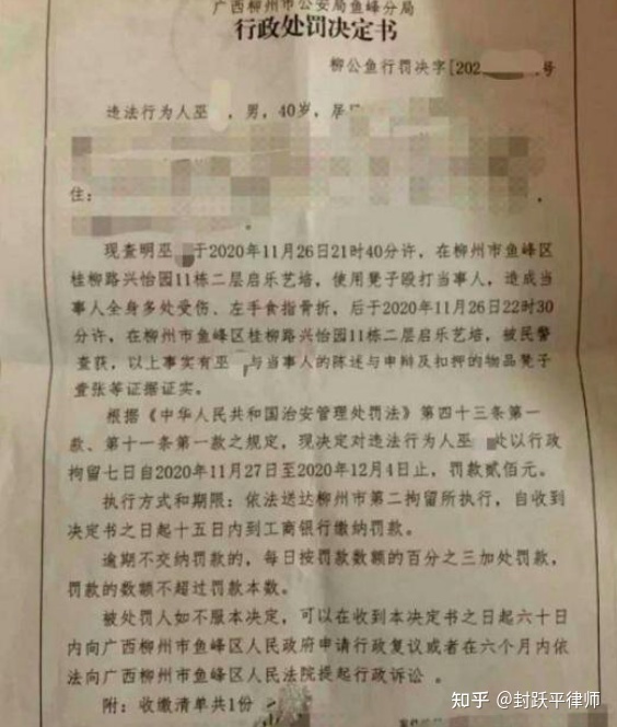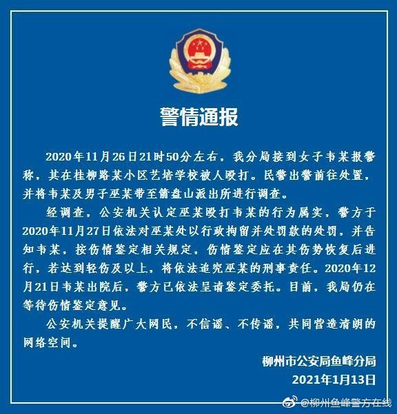 针对网传广西“柳州鱼峰一钢琴女教师办离职被殴打”一事,柳州市公安局鱼峰分局1月13日发布警情通报称,打人者巫某已于2020年11月27日被处行政拘留和罚款,至于是否追究巫某的刑事责任,该局仍在等待伤情鉴定意见。警情通报。 图片来源:微博“柳州鱼峰警方在线” 警情通报。 图片来源:微博“柳州鱼峰警方在线”